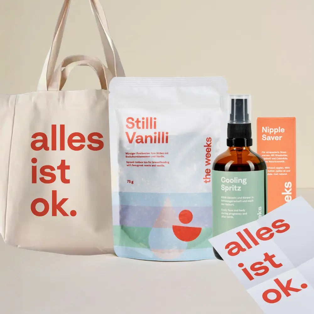 Recibirás un espray corporal para la pesadez de piernas antes del parto y los sofocos después, además de artículos esenciales para la lactancia: el protector de pezones y nuestros discos absorbentes de lactancia. El set se completa con nuestro nuevo té de lactancia y un impresionante póster posparto.